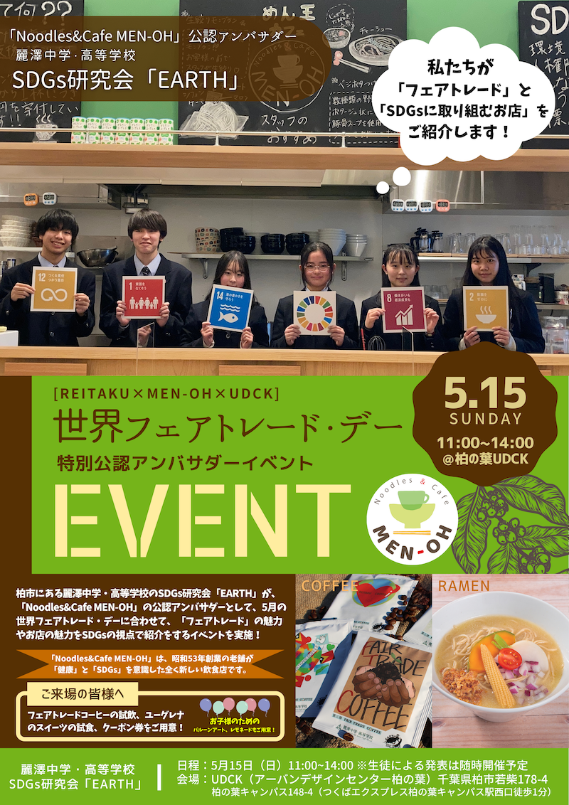 柏市にある麗澤中学・高等学校のSDGs研究会「EARTH」 が、地元ラーメン店「Noodles&Cafe MEN-OH」の公認アンバサダーとして、 5月の世界フェアトレード・デーに合わせて、「フェアトレード」 の魅力やお店の魅力をSDGsの視点で紹介をするイベントを実施 !