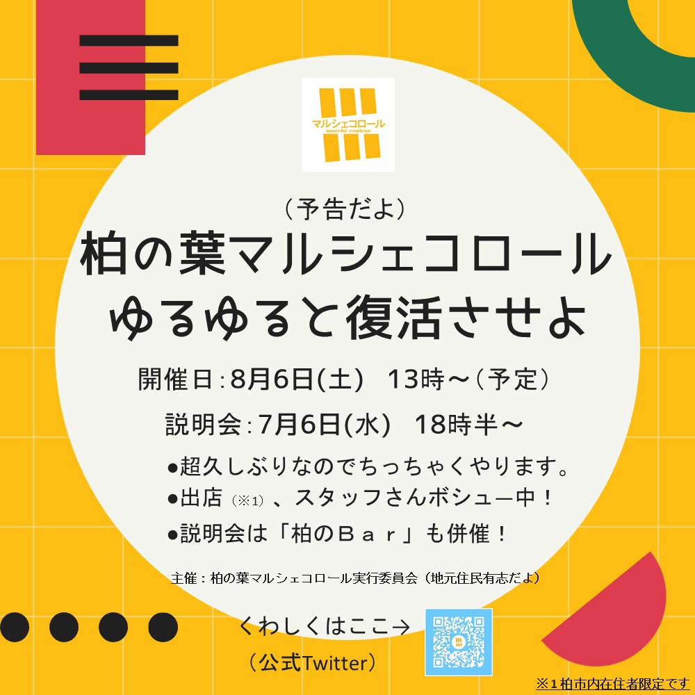 - 主催:「柏の葉マルシェコロールをゆるゆるとふっかつさせよ」実行委員会