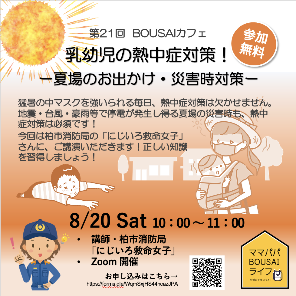 第21回BOUSAIカフェ 「乳幼児の熱中症対策! 夏場のお出かけ・災害時対策」withにじいろ救命女子