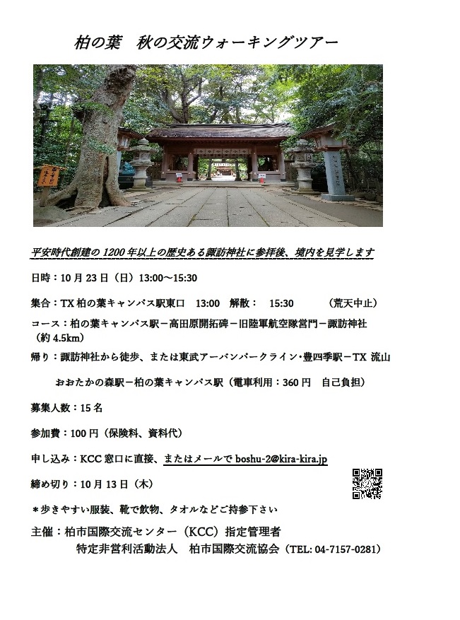 秋の交流ウォーキングツアー イベント詳細 日程: 2022年10月23日 イベント詳細 日付: 2022年10月23日 1:00 PM – 3:00 PM カテゴリ: イベント/event, スポーツ・健康/sports・health, 子どもも参加できる/kids friendly, 知る・学ぶ/education 「おすわさま」と地元で親しまれている流山市駒木の諏訪神社は、1200年以上の歴史ある神社です。柏の葉キャンパスから史跡を巡りながら、諏訪神社まで歩きます。参拝後、高い木に囲まれた神聖な雰囲気の境内を見学します。 イベント詳細 開催日:2022/10/23 時間:13:00-15:00 開催場所:柏の葉エリア 主催者名:柏市国際交流センター指定管理者特定非営利団体柏市国際交流協会 問合せ先: 04-7157-0281 イベントURL:https://www.kcc.kira-kira.jp/events.html#20221023 LINE公式アカウント UDCKの公式アカウントを友だちに追加すると、気になるイベント情報がスマホに届きます。 メールニュース登録 UDCKでは月に2回メールニュースを配信しています。 柏の葉から最新のまちづくり情報をお届けします。 メールアドレスを入力してください *