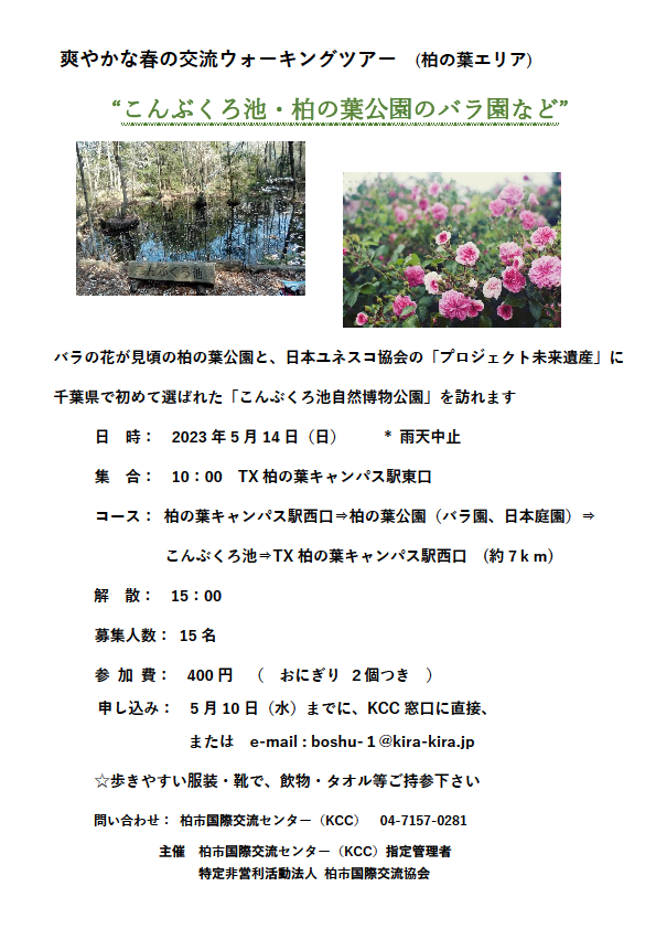 爽やかな春の交流ウォーキングツアー イベント詳細 日程: 2023年5月14日 イベント詳細 日付: 2023年5月14日 10:00 AM – 3:00 PM カテゴリ: イベント/event, スポーツ・健康/sports・health, 子どもも参加できる/kids friendly, 知る・学ぶ/education バラが見頃の柏の葉公園と、日本ユネスコ協会の「プロジェクト未来遺産」に千葉県で初めて選ばれた「こんぶくろ池自然博物公園」を訪れます。 コース:柏の葉キャンパス駅ー柏の葉公園ーこんぶくろ池ー柏の葉キャンパス駅(約7km) イベント詳細 開催日:2023年5月14日 時間:10:00~15:00 開催場所:柏の葉キャンパス駅 主催者名:柏市国際交流センター指定管理者NPO法人柏市国際交流協会 問合せ先:boshu-1@kira-kira.jp イベントURL:https://www.kcc.kira-kira.jp/ UDCKの公式アカウントを友だちに追加すると、気になるイベント情報がスマホに届きます。 メールニュース登録 UDCKでは月に2回メールニュースを配信しています。 柏の葉から最新のまちづくり情報をお届けします。 メールアドレスを入力してください *