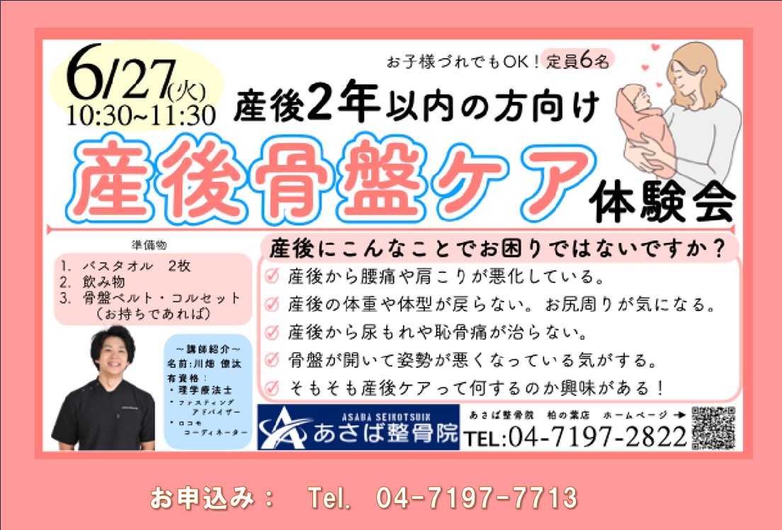 産後骨盤ケア体験会 (無料、産後2年以内の方向け) イベント詳細 日程: 2023年6月27日 イベント詳細 日付: 2023年6月27日 10:30 AM – 11:30 AM カテゴリ: イベント/event, スポーツ・健康/sports・health, 無料で参加できる/free ご出産後に、腰痛や肩こり、体重や体形が戻らないなど、産後のお困りごとはありませんか? 理学療法士の川畑僚太先生が ◆ 産後ケアってなんで重要なの? ◆ 産後トラブルの原因とは? ◆ 産後ケア・セルフケアについて をわかりやすくお話しし、実際に体験していただきます。 お子様と一緒にぜひご参加ください。 ・日時: 6月27日(火) 10:30~11:30 ・場所: ららぽーと柏の葉北館3F まちの健康研究所あ・し・た ・対象: 産後2年以内の方 ・定員: 6名 ・参加費: 無料 ・持ち物: バスタオル2枚、飲み物、骨盤ベルト・コルセット(あれば) ・お申込み: Tel. 04-7197-7713 まちの健康研究所あ・し・た ・お問合せ: Tel. 04-7197-2822 あさば整骨院 柏の葉店 イベント詳細 開催日:6月27日(火) 時間:10:30~11:30 開催場所:ららぽーと柏の葉北館3F まちの健康研究所あ・し・た 問合せ先:Tel. 04-7197-2822 あさば整骨院 柏の葉店 UDCKの公式アカウントを友だちに追加すると、気になるイベント情報がスマホに届きます。 メールニュース登録 UDCKでは月に2回メールニュースを配信しています。 柏の葉から最新のまちづくり情報をお届けします。 メールアドレスを入力してください *