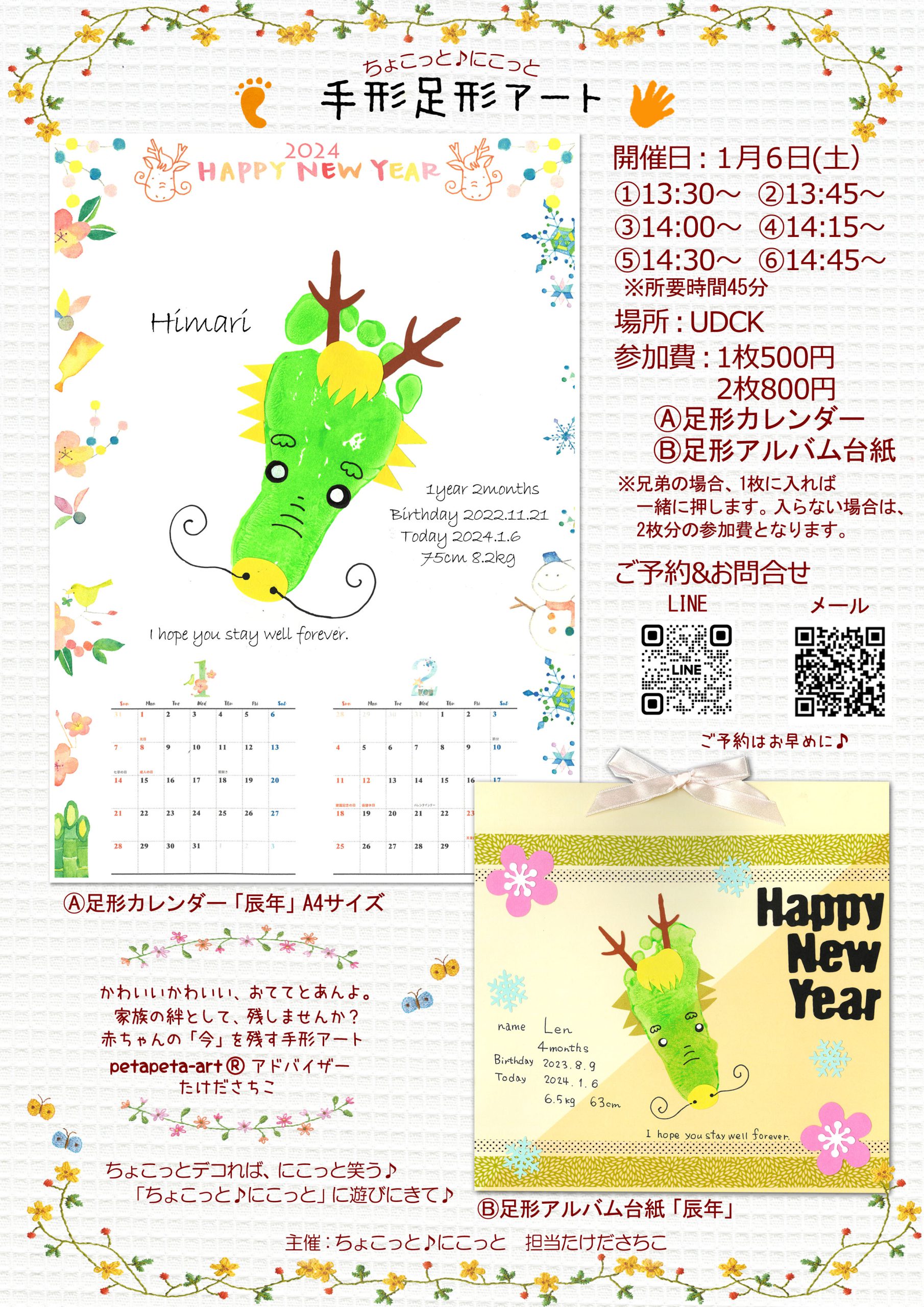 足形アート『辰年編』 イベント詳細 日程: 2024年1月6日 イベント詳細 日付: 2024年1月6日 1:30 PM – 3:30 PM カテゴリ: イベント/event, 子どもも参加できる/kids friendly すくすく大きくなるあんよとおてて。 大切なこどもの成長を可愛く残しませんか? ペタッと足形を押して、楽しくデコレーション。 簡単に出来る型抜きと見本があるので、誰でもできますよ。 今回は、2024年を迎えるにふさわしい「辰年編」。オリジナルです♪ Ⓐ足形カレンダー、Ⓑ足形アルバム台紙があります。 <ご予約時間>各1組※所要時間は45分 ①13:30~ ②13:45~ ③14:00~ ④14:15~ ⑤14:30~ ⑥14:45~ <参加費> 1枚500円 2枚800円 ★足に湿疹がある場合、参加をお断りさせて頂きます。必ず足裏をチェックしてからお越しください。 ★兄弟の場合、1枚に入れば一緒に足形を押します。 ★詳細はチラシをご確認ください。 ちょこっとデコれば、にこっとスマイル♪ 『ちょこっと♪にこっと』に遊びにおいで! イベント詳細 開催日:2024/01/06 時間:13:30-15:30 開催場所:UDCK 主催者名:ちょこっと♪にこっと 問合せ先:chocotto.nicotto@gmail.com イベントURL:https://www.instagram.com/chocotto.nicotto UDCKの公式アカウントを友だちに追加すると、気になるイベント情報がスマホに届きます。 メールニュース登録 UDCKでは月に2回メールニュースを配信しています。 柏の葉から最新のまちづくり情報をお届けします。 メールアドレスを入力してください *