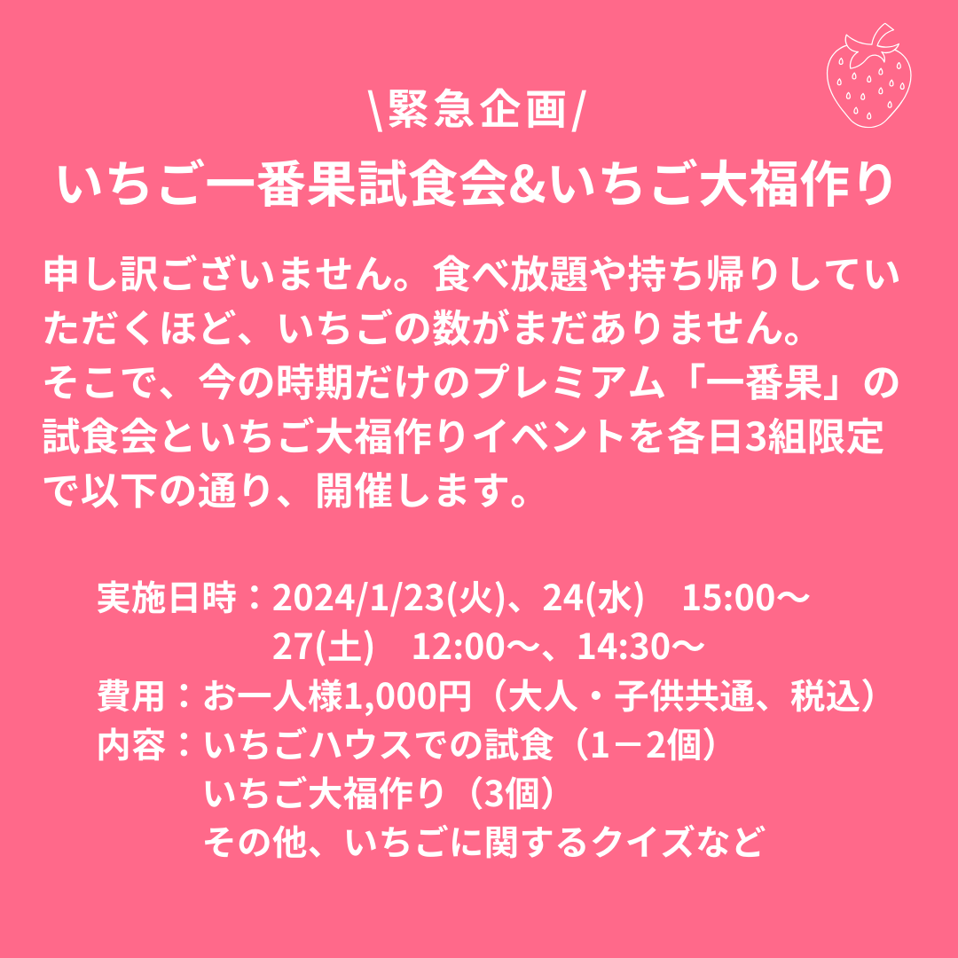 今しか味わえないいちごの一番果を試食した上で、いちご大福を作り、味わいます。年始に七草がゆ作りとともに行い、人気だったことから、急遽、追加開催。各回3組限定ですので、お申し込みはお早めに!