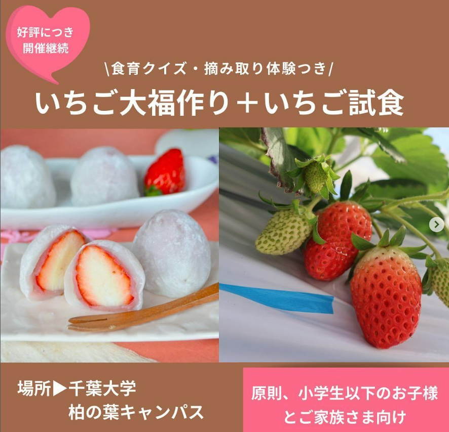 いちご大福作りと収穫体験 イベント詳細 日程: 2024年2月10日 イベント詳細 日付: 2024年2月10日 9:00 AM – 3月31日 4:30 PM カテゴリ: イベント/event, 子どもも参加できる/kids friendly 千葉大柏の葉キャンパス内のいちごハウスでいちごを収穫し、生で試食の上、いちご大福を作って、ご賞味いただきます。とれたてのいちご生食のおいしさを味わうとともに、大福作りを親子で楽しみながら体験してみてください。 イベント詳細 開催日:2024/2/10~2024/3/31 時間:9:00~~16:30(日により異なる) 開催場所:千葉大柏の葉キャンパス 主催者名:株式会社LocoDoor 問い合わせ先:locodoor@locodoor.resona-gr.co.jp イベントURL:https://www.instagram.com/p/C3CGQS6vEM7/?img_index=1 UDCKの公式アカウントを友だちに追加すると、気になるイベント情報がスマホに届きます。 メールニュース登録 UDCKでは月に2回メールニュースを配信しています。 柏の葉から最新のまちづくり情報をお届けします。 メールアドレスを入力してください *