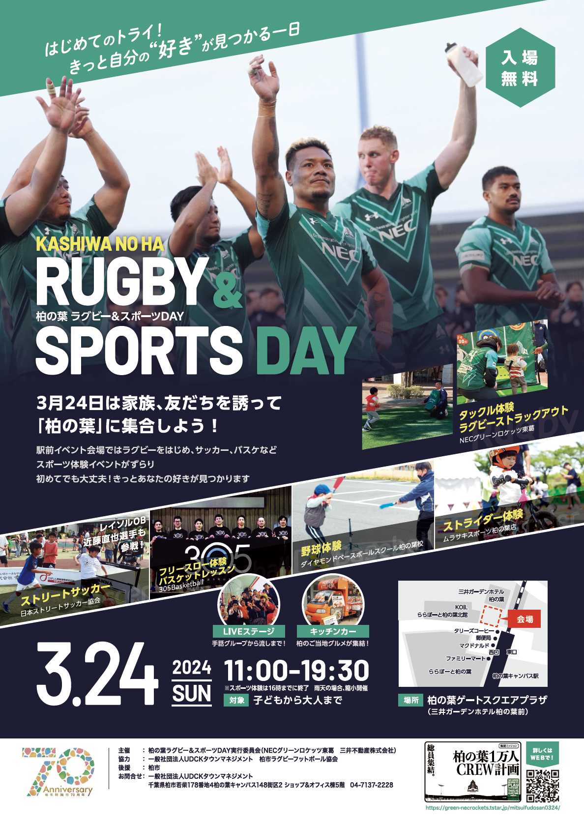 柏の葉 ラグビー&スポーツDAY イベント詳細 日程: 2024年3月24日 イベント詳細 日付: 2024年3月24日 11:00 AM – 7:30 PM カテゴリ: お知らせ, イベント/event, スポーツ・健康/sports・health, 子どもも参加できる/kids friendly, 無料で参加できる/free 3月24日は家族、友だちを誘って「柏の葉」に集合しよう! イベント詳細 開催日:2024年3月24日(日) 時間:11:00~19:30 開催場所:柏の葉ゲートスクエアプラザ(三井ガーデンホテル柏の葉前) 主催者名:柏の葉ラグビー&スポーツDAY実行委員会 問合せ先:一般社団法人UDCKタウンマネジメント(04-7137-228) UDCKの公式アカウントを友だちに追加すると、気になるイベント情報がスマホに届きます。 メールニュース登録 UDCKでは不定期でメールニュースを配信しています。 柏の葉から最新のまちづくり情報をお届けします。 ◉メールアドレス * ◉性別 *男性女性未選択 ◉お住まい(最寄り駅) *柏の葉キャンパス柏たなかその他柏市市外 /* real people should not fill this in and expect good things – do not remove this or risk form bot signups */