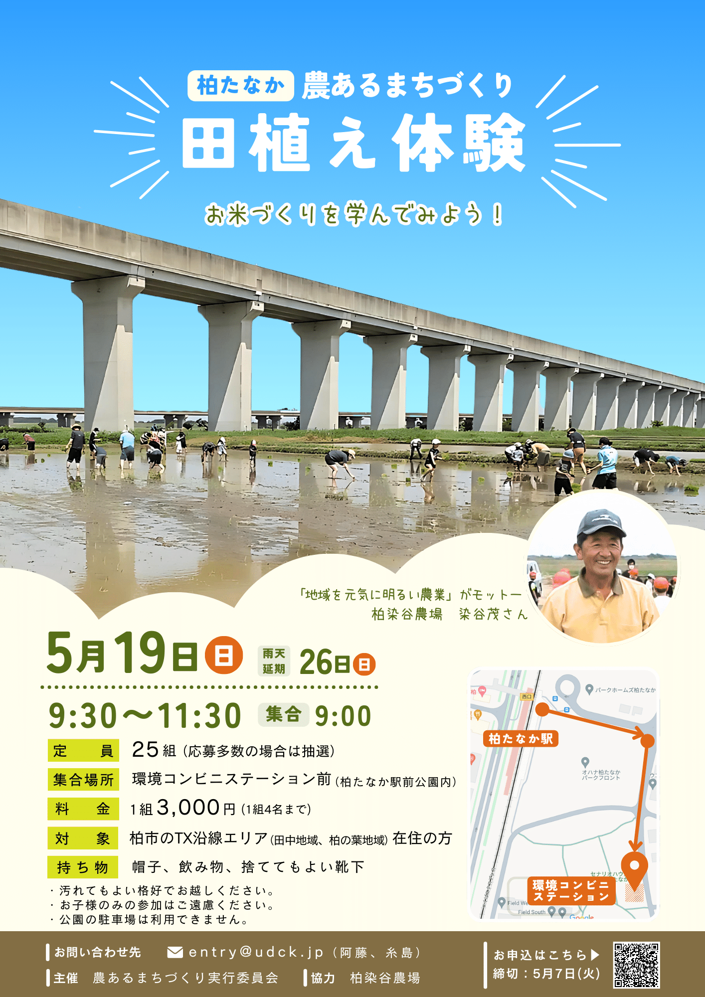 柏たなか農あるまちづくり 田植え体験 イベント詳細 日程: 2024年5月19日 イベント詳細 日付: 2024年5月19日 9:30 AM – 11:30 AM カテゴリ: イベント/event, 子どもも参加できる/kids friendly, 知る・学ぶ/education 農あるまちづくりイベント第1弾「お米づくりを学んでみよう!」 教えてくれるのは、「地域を元気に明るい農業」がモットー 柏染谷農場 染谷茂さんです。 —————————————– 申込み締切日:5月12日(日) —————————————– 開催日:5月19日(日) 予備日:5月26日(日) 定員:25組(応募多数の場合抽選) 料金:1組3000円(1組4名まで) 支払い方法:現金のみ 対象: 柏市のTX沿線エリア(田中地域、柏の葉地域)にお住まいの方 持ち物:帽子、飲み物、捨ててもよい靴下 注意事項: ・汚れてもよい格好でお越しください。 ・お子様のみの参加はご遠慮ください。 ・公園駐車場は利用できません。 ・支払い方法は、現金のみです。クレジットカード、QRコード決済等はご利用できません。 イベント詳細 開催日:2024年5月19日(日) 時間:9:30-11:30 開催場所:集合場所:環境コンビニステーション(柏たなか駅前公園内) 主催者名:農あるまちづくり実行委員会 問合せ先:entry@udck.jp(阿藤、糸島) イベントUR:https://forms.gle/f3LS9AnkAwDMoeaZ8 UDCKの公式アカウントを友だちに追加すると、気になるイベント情報がスマホに届きます。 メールニュース登録 UDCKでは不定期でメールニュースを配信しています。 柏の葉から最新のまちづくり情報をお届けします。 ◉メールアドレス * ◉性別 *男性女性未選択 ◉お住まい(最寄り駅) *柏の葉キャンパス柏たなかその他柏市市外 /* real people should not fill this in and expect good things – do not remove this or risk form bot signups */