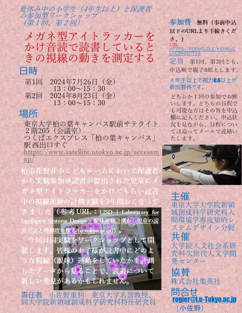 東京大学大学院新領域創成科学研究科人間環境学専攻知的システムデザイン分野では、集英社寄付金研究プロジェクトとして、柏市花野井小こどもルームにおいて保護者から実験参加承諾書が提出された児童にメガネ型アイトラッカーをかけてもらい読書中の視線運動の計測実験を3年間おこなってきました(参考URL:LISD | Laboratory for Intelligent Systems Design – 眼球運動計測から児童の読書方法と理解度を探る (u-tokyo.ac.jp))。