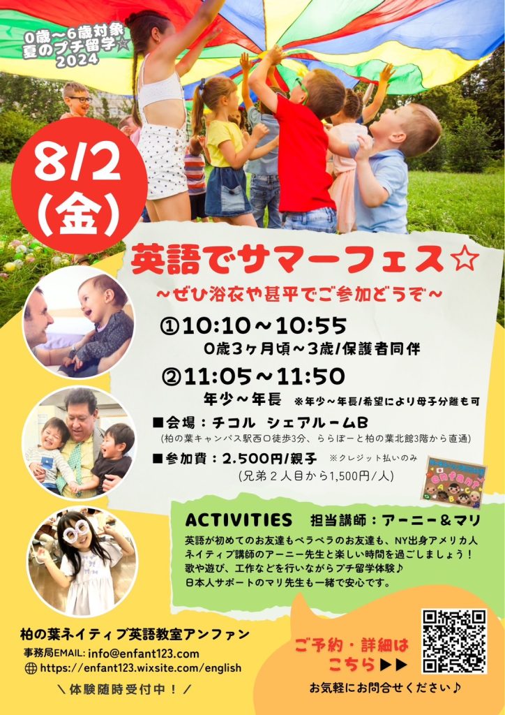 0歳~6歳対象 夏のプチ留学☆2024 夏休み恒例!『英語でサマーフェス☆』~ぜひ浴衣や甚平でご参加どうぞ♪~ イベント詳細 日程: 2024年8月2日 イベント詳細 日付: 2024年8月2日 10:10 AM – 11:50 AM カテゴリ: イベント/event, 子どもも参加できる/kids friendly 英語が初めてのお友達もペラペラのお友達も、NY出身アメリカ人ネイティブ講師のアーニー先生と楽しい時間を過ごしましょう! 歌や遊び、工作などを行いながらプチ留学体験♪ 日本人サポート講師のマリ先生も一緒で安心です。 ①10:10~10:55 0歳3ヶ月~3歳のお子様と保護者 ②11:05~11:50 年少~年長のお子様と保護者 ※年少~年長のお子様は、母子分離での参加も可能です。 イベント詳細 開催日:2024/08/02 時間:10:10-11:50 開催場所:チコル 主催者名:柏の葉ネイティブ英語教室アンファン 問合せ先:info@enfant123.com イベントURL:https://enfant123.wixsite.com/english/%E3%82%A4%E3%83%99%E3%83%B3%E3%83%88 UDCKの公式アカウントを友だちに追加すると、気になるイベント情報がスマホに届きます。 メールニュース登録 UDCKでは不定期でメールニュースを配信しています。 柏の葉から最新のまちづくり情報をお届けします。 ◉メールアドレス * ◉性別 *男性女性未選択 ◉お住まい(最寄り駅) *柏の葉キャンパス柏たなかその他柏市市外 /* real people should not fill this in and expect good things – do not remove this or risk form bot signups */