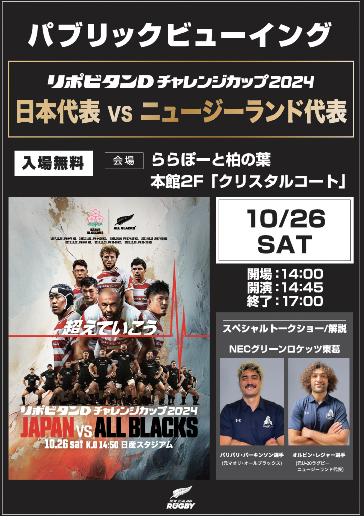 10/26 オールブラックスパブリックビューイング イベント詳細 日程: 2024年10月26日 イベント詳細 日付: 2024年10月26日 2:00 PM – 5:00 PM カテゴリ: イベント/event, スポーツ・健康/sports・health, 無料で参加できる/free リポビタンDチャレンジカップ 日本代表VSニュージーランド イベント詳細 開催日:2024年10月26日(土) 時間:14:00-17:00 開催場所:ららぽーと柏の葉2階 クリスタルコート 主催者名:オールブラックス 問合せ先:info@udck.jp イベントURL:https://machimaru.studio.site/posts/9-lNKT4S UDCKの公式アカウントを友だちに追加すると、気になるイベント情報がスマホに届きます。 メールニュース登録 UDCKでは不定期でメールニュースを配信しています。 柏の葉から最新のまちづくり情報をお届けします。 ◉メールアドレス * ◉性別 *男性女性未選択 ◉お住まい(最寄り駅) *柏の葉キャンパス柏たなかその他柏市市外 /* real people should not fill this in and expect good things – do not remove this or risk form bot signups */