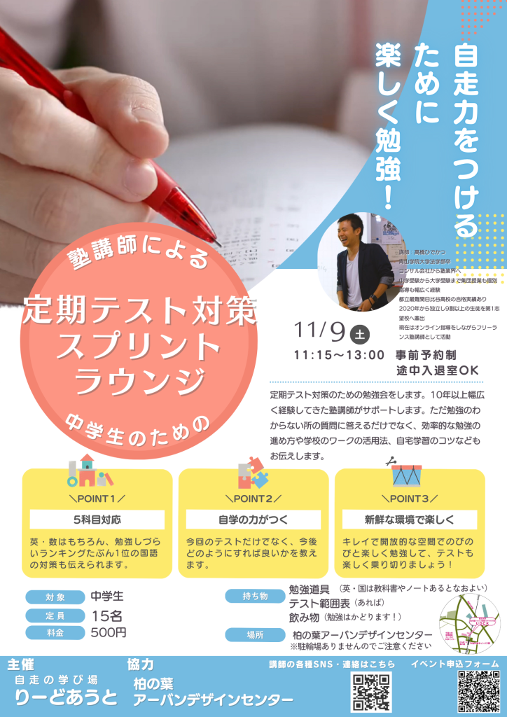 定期テスト対策スプリントラウンジ イベント詳細 日程: 2024年11月9日 イベント詳細 日付: 2024年11月9日 11:15 AM – 1:00 PM カテゴリ: イベント/event, 子どもも参加できる/kids friendly, 知る・学ぶ/education 定期テスト対策のための勉強会をします。10年以上幅広く経験してきた塾講師がサポートします。ただ勉強のわからない所の質問に答えるだけでなく、効率的な勉強の進め方や学校のワークの活用法、自宅学習のコツなどもお伝えします。 イベント詳細 開催日:2024/11/9 時間:11:15-13:00 開催場所:柏の葉アーバンデザインセンター 主催者名:自走の学び場りーどあうと/高橋ひでかつ 問合せ先:glavnoye.litso56@gmail.com イベントURL:https://docs.google.com/forms/d/e/1FAIpQLSdp4zdkT9VhvNJ22bEjkizEQVyUZWazI0PkjHSehs8t6EBF1g/viewform?usp=sf_link UDCKの公式アカウントを友だちに追加すると、気になるイベント情報がスマホに届きます。 メールニュース登録 UDCKでは不定期でメールニュースを配信しています。 柏の葉から最新のまちづくり情報をお届けします。 ◉メールアドレス * ◉性別 *男性女性未選択 ◉お住まい(最寄り駅) *柏の葉キャンパス柏たなかその他柏市市外 /* real people should not fill this in and expect good things – do not remove this or risk form bot signups */