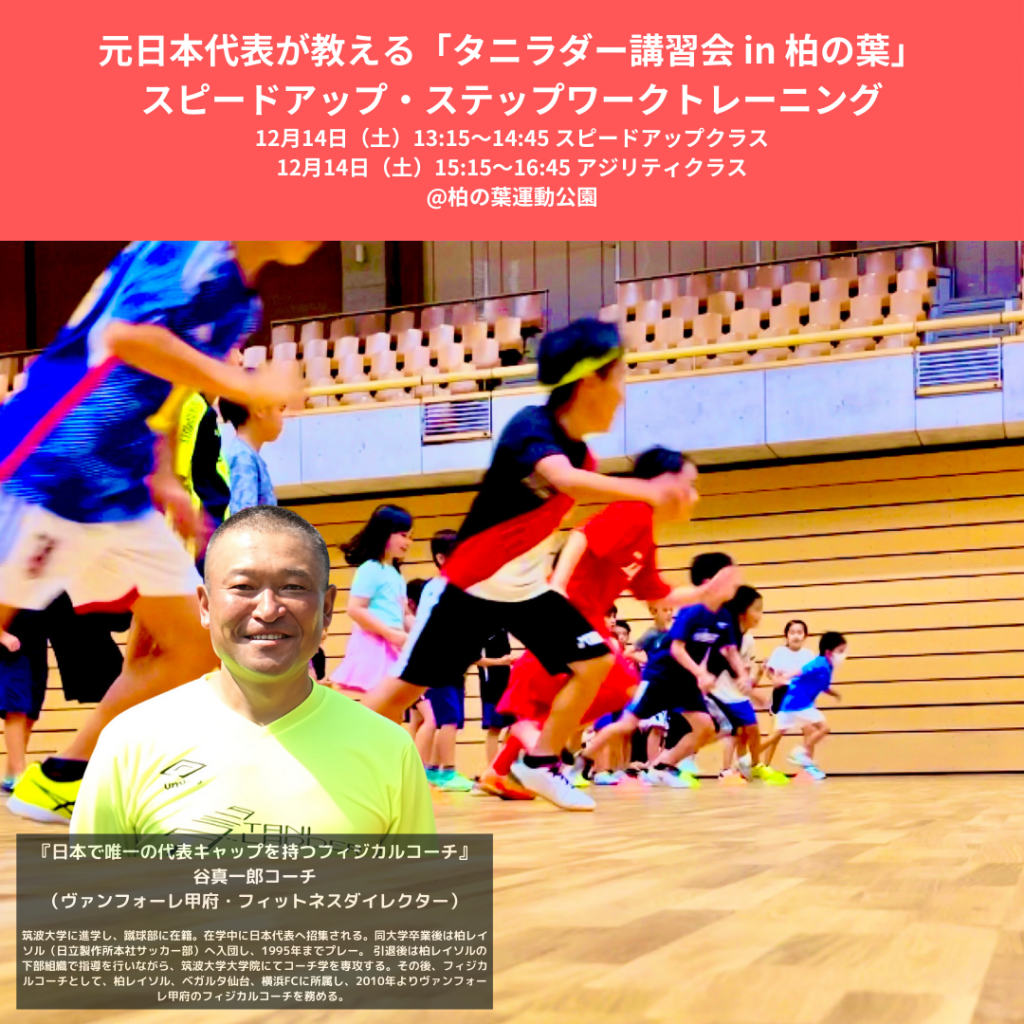 元サッカー日本代表で、ヴァンフォーレ甲府のフィジカルコーチ谷真一郎が考案したスピード強化トレーニングの講習会。「タニラダー」とは4マスの特殊なラダーを使い、サッカーの動きから逆算したステップ・ワークや身体の姿勢、使い方をマスターするトレーニングです。サッカーでは、Jリーグ12チーム、Jリーグアカデミー5チームがタニラダーを採用しています。