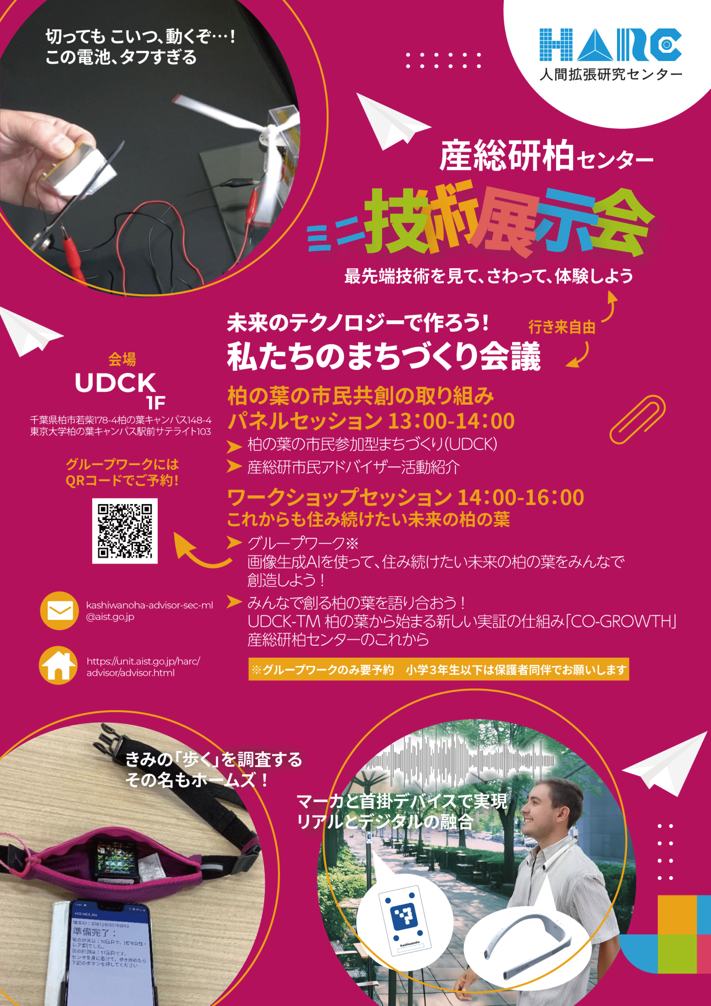 未来の技術で創ろう!私たちのまちづくり会議ー同時開催!産総研柏センターミニ技術展示会ー イベント詳細 日程: 2025年3月22日 イベント詳細 日付: 2025年3月22日 1:00 PM – 4:00 PM カテゴリ: イベント/event, 子どもも参加できる/kids friendly, 無料で参加できる/free, 知る・学ぶ/education 産総研市民アドバイザー×UDCK 市民共創コラボイベント「未来のテクノロジーで作ろう!私たちのまちづくり会議」を開催します! さらに産総研柏センターミニ技術展示会も同時開催! 宇宙開発でも活躍している高精度マーカや、歩き方で年齢がわかる歩行属性判定システム、曲げられるフレキシブル電池などが見て、さわって、体験できます! ミニ技術展示会とまちづくり会議は行き来自由です。 まちづくり会議の詳しい内容は以下になります。 ———- 柏の葉の市民共創の取り組み パネルセッション 13:00-14:00 ・柏の葉の市民参加型まちづくり(UDCK) ・産総研市民アドバイザー活動紹介 ワークショップセッション これからも住み続けたい未来の柏の葉 14:00-16:00 ・グループワーク(※要予約、小学3年生以下は保護者同伴) 生成AIを使って、住み続けたい未来の柏の葉をみんなで創造しよう! ・みんなで創る柏の葉を語り合おう! UDCK-TM 柏の葉から始まる新しい実証の仕組み「CO-GROWTH」 産総研柏センターのこれから ※グループワークのみお申し込みが必要です。申込フォーム:https://forms.office.com/r/V3RQ7veMyQ イベント詳細 開催日:2025/3/22 開始時間:13:00 終了日:2025/3/22 終了時間:16:00 開催場所:UDCK 主催者名:産総研 柏の葉市民アドバイザー事務局 問い合わせ先:kashiwanoha-advisor-sec-ml@aist.go.jp イベントURL:https://www.facebook.com/events/1166253351830171/ UDCKの公式アカウントを友だちに追加すると、気になるイベント情報がスマホに届きます。 メールニュース登録 UDCKでは不定期でメールニュースを配信しています。 柏の葉から最新のまちづくり情報をお届けします。 ◉メールアドレス * ◉性別 *男性女性未選択 ◉お住まい(最寄り駅) *柏の葉キャンパス柏たなかその他柏市市外 /* real people should not fill this in and expect good things – do not remove this or risk form bot signups */