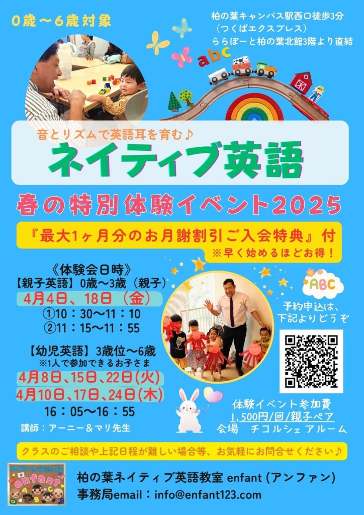 0歳~6歳対象♪ネイティブ英語☆春の特別体験イベント2025 イベント詳細 日程: 2025年4月4日 イベント詳細 日付: 2025年4月4日 10:00 AM – 24日 5:00 PM カテゴリ: イベント/event, 子どもも参加できる/kids friendly 0歳~6歳対象 音とリズムで英語耳を育む♪ ネイティブ英語 春の特別体験イベント2025 『最大1ヵ月分のお月謝割引ご入会特典』付 ※早く始めるほどお得! <体験会日時> 【親子英語】0歳~3歳(親子) 4月4日、18日(金) ①10:30~11:15 ②11:15~11:55 【幼児英語】3歳位~6歳 ※1人で参加できるお子さま 4月8日、15日、22日(火) 4月10日、17日、24日(木) 16:05~16:55 クラスの相談や上記日程が難しい場合等、お気軽にお問い合わせ下さい♪ イベント詳細 開催場所:チコル 主催者名:柏の葉ネイティブ英語教室アンファン 問合せ先:mailto:info@enfant123.com イベントURL:https://enfant123.wixsite.com/english UDCKの公式アカウントを友だちに追加すると、気になるイベント情報がスマホに届きます。 メールニュース登録 UDCKでは不定期でメールニュースを配信しています。 柏の葉から最新のまちづくり情報をお届けします。 ◉メールアドレス * ◉性別 *男性女性未選択 ◉お住まい(最寄り駅) *柏の葉キャンパス柏たなかその他柏市市外 /* real people should not fill this in and expect good things – do not remove this or risk form bot signups */