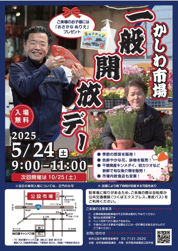 柏市公設市場一般開放デー イベント詳細 日程: 2025年5月24日 イベント詳細 日付: 2025年5月24日 9:00 AM – 11:00 AM カテゴリ: イベント/event, 子どもも参加できる/kids friendly, 無料で参加できる/free 昨年度からスタートした一般開放デーですが,1回あたり約2,500名が来場し大盛況となりました。 今回は場内事業者が季節の青果特別販売,花の特別販売を行います。 1イベント内容 (1) 千葉県産キンメダイやカツオなど新鮮で旬な魚の販売 (2) 場内事業者による柏産をはじめとする季節の野菜を販売 (3) 花き仲卸業者による色鮮やかな花の販売 (4) 関連食品棟で種類豊富な精肉,海苔,茶,調味料,お菓子,日用品雑貨等を販売 (5) 飲食店舗もイベント時間に合わせて営業 (6) お子様には”おさかなぬりえ”をプレゼント (7) 水産物部お買い物した方先着200名様にソフトドリンクプレゼント 2注意事項 駐車場に限りがありますので,可能な限り自転車や公共交通機関を利用頂き御来場ください。 商品完売等により、予定よりも早く閉店する店舗がありますのでご了承ください。 イベント詳細 開催日: 2025年5月24日 開始時間: 9:00 終了日: 2025年5月24日 終了時間: 11:00 開催場所: 柏市公設市場(柏市若柴69番地の1) 主催者名: 主催:柏市場連絡協議会 共催:柏市経済産業部公設市場 問い合わせ先: 04-7131−2620(柏市公設市場管理事務所) イベントURL: https://www.city.kashiwa.lg.jp/kosetsuichiba/event/kosetsusijoippankaiho241026.html UDCKの公式アカウントを友だちに追加すると、気になるイベント情報がスマホに届きます。 メールニュース登録 UDCKでは不定期でメールニュースを配信しています。 柏の葉から最新のまちづくり情報をお届けします。 ◉メールアドレス * ◉性別 *男性女性未選択 ◉お住まい(最寄り駅) *柏の葉キャンパス柏たなかその他柏市市外 /* real people should not fill this in and expect good things – do not remove this or risk form bot signups */