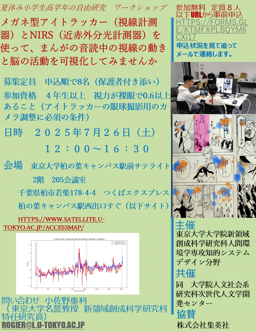 夏休み小学生高学年の自由研究 ワークショップ(第3回)「メガネ型アイトラッカー(視線計測器)とNIRS(近赤外分光計測器)を使って、まんがの音読中の視線の動きと脳の活動を可視化してみませんか」 イベント詳細 日程: 2025年7月26日 イベント詳細 日付: 2025年7月26日 12:00 PM – 4:30 PM カテゴリ: イベント/event, 子どもも参加できる/kids friendly, 無料で参加できる/free, 知る・学ぶ/education 「メガネ型アイトラッカー(視線計測器)とNIRS(近赤外分光計測器)を使って、まんがの音読中の視線の動きと脳の活動を可視化してみませんか」 開催日時 2025年7月26日12:00~16:30 定員 申込み順で8名(保護者付き添い) 開催場所 東京大学柏の葉キャンパス駅前サテライト 2階205会議室 申込方法 【参加資格】 小学4年生以上 視力が裸眼で0.6以上あること(アイトラッカーの眼球撮影用のカメラ調整に必須の条件です) 参加無料です、事前に下記URLのフォームからお申し込みください。 https://forms.gle/KTMFxPLbQyM6Cxi17 *申込状況をみて、こちらからご記入のe-mailに、保護者への事前説明等の詳細についてご連絡いたします。 イベント詳細 開催日: 2025年7月26日(土) 開始時間: 12:00‐ 終了日: 2025年7月26日(土) 終了時間: 16:30 開催場所: 東京大学柏の葉キャンパス駅前サテライト2階205会議室 https://www.satellite.u-tokyo.ac.jp/accessmap/ 主催者名: 主催:東京大学大学院新領域創成科学研究科人間環境学専攻知的システムデザイン分野 共催:同 大学院人文社会系研究科次世代人文学開発センター 協賛:株式会社集英社 問い合わせ先: 小佐野重利(東京大学名誉教授 大学院新領域創成科学研究科特任研究員) メールアドレス:rogier[at]l.u-tokyo.ac.jp ※[at]は@に置き換えてください イベントURL: https://www.l.u-tokyo.ac.jp/event/2025/eye-tracking20250726.html UDCKの公式アカウントを友だちに追加すると、気になるイベント情報がスマホに届きます。 メールニュース登録 UDCKでは不定期でメールニュースを配信しています。 柏の葉から最新のまちづくり情報をお届けします。 ◉メールアドレス * ◉性別 *男性女性未選択 ◉お住まい(最寄り駅) *柏の葉キャンパス柏たなかその他柏市市外 /* real people should not fill this in and expect good things – do not remove this or risk form bot signups */