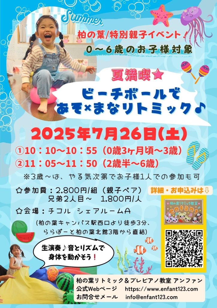 0歳~6歳のお子様対象☆『夏満喫☆ビーチボールでリトミック♪』 イベント詳細 日程: 2025年7月26日 イベント詳細 日付: 2025年7月26日 10:10 AM – 11:50 AM カテゴリ: イベント/event, 子どもも参加できる/kids friendly 柏の葉/特別イベント! 0歳~6歳のお子様対象☆ アンファンのあそ×まなリトミック 『夏満喫☆ビーチボールでリトミック』 by 柏の葉リトミック教室アンファン 音楽やリズムを心で感じ身体で表現することで、音楽的感性や集中力、表現力、創造力を養うリトミック♪ 今回は、子どもたちの大好きなビーチボールが登場! 一足先に、楽しい夏を先取りしましょう♪ ■開催日時・対象 2025年7月26日(土) ①10:10~10:55 0歳3か月頃~3歳のお子様と保護者 ②11:05~11:50 2歳6か月頃~6歳のお子様と保護者※ ※3歳頃~、やる気があればお子様のみでの参加も可 イベント詳細 開催日:2025/7/26 時間:10:10-11:50 開催場所:チコル 主催者名:柏の葉リトミック教室アンファン 問合せ先:info@enfant123.com イベントURL:https://www.enfant123.com/%E5%A4%8F%E3%83%AA%E3%83%88%E3%83%9F%E3%83%83%E3%82%AF%E3%82%A4%E3%83%99%E3%83%B3%E3%83%88 UDCKの公式アカウントを友だちに追加すると、気になるイベント情報がスマホに届きます。 メールニュース登録 UDCKでは不定期でメールニュースを配信しています。 柏の葉から最新のまちづくり情報をお届けします。 ◉メールアドレス * ◉性別 *男性女性未選択 ◉お住まい(最寄り駅) *柏の葉キャンパス柏たなかその他柏市市外 /* real people should not fill this in and expect good things – do not remove this or risk form bot signups */