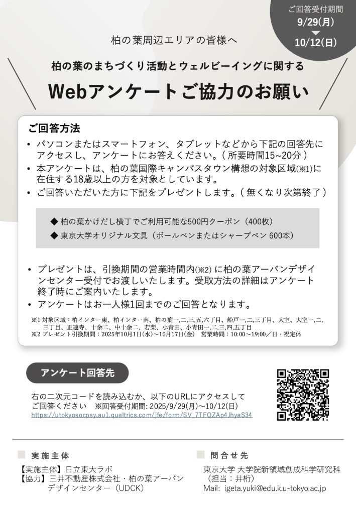 柏の葉のまちづくり活動とウェルビーイングに関するWebアンケートご協力のお願い イベント詳細 日程: 2025年9月29日 イベント詳細 日付: 2025年9月29 – 10月17日 カテゴリ: イベント/event 【謝礼あり webアンケートご協力のお願い】 柏の葉周辺エリアの皆様へ 柏の葉のまちづくり活動とウェルビーイングに関するWebアンケートご協力のお願い (ご回答受付期間:9/29(月)〜10/12(日)) 【ご回答方法】 パソコンまたはスマートフォン、タブレットなどから下記の回答先にアクセスし、アンケートにお答えください。(所要時間15~20分) 本アンケートは、柏の葉国際キャンパスタウン構想の対象区域(※1)に在住する18歳以上の方を対象としています。 ご回答いただいた方に下記をプレゼントします。 (無くなり次第終了) ◆ 柏の葉かけだし横丁でご利用可能な500円クーポン(400枚) ◆ 東京大学オリジナル文具(ボールペンまたはシャープペン 600本) プレゼントは、引換期間の営業時間内(※2) に柏の葉アーバンデザインセンター受付でお渡しいたします。受取方法の詳細はアンケート終了時にご案内いたします。 アンケートはお一人様1回までのご回答となります。 ※1 対象区域:柏インター東、柏インター南、柏の葉一,二,三,五,六丁目、船戸一,二,三丁目、大室、大室一,二,三丁目、正連寺、十余二、中十余二、若柴、小青田、小青田一,二,三,四,五丁目 ※2 プレゼント引換期間:2025年10月1日(水)〜10月17日(金) 営業時間:10:00〜19:00/日・祝定休 【アンケート回答先】 二次元コードを読み込むか、以下のURLにアクセスしてご回答ください ※回答受付期間: 2025/9/29(月)〜10/12(日) https://utokyosocpsy.au1.qualtrics.com/jfe/form/SV_7TFQZAp4JhyaS34 【実施主体】 実施主体:日立東大ラボ 協力:三井不動産株式会社・柏の葉アーバンデザインセンター(UDCK) 【問合せ先】 東京大学 大学院新領域創成科学研究科(担当:井桁) Mail: igeta.yuki@edu.k.u-tokyo.ac.jp — UDCKの公式アカウントを友だちに追加すると、気になるイベント情報がスマホに届きます。 メールニュース登録 UDCKでは不定期でメールニュースを配信しています。 柏の葉から最新のまちづくり情報をお届けします。 ◉メールアドレス * ◉性別 *男性女性未選択 ◉お住まい(最寄り駅) *柏の葉キャンパス柏たなかその他柏市市外 /* real people should not fill this in and expect good things – do not remove this or risk form bot signups */