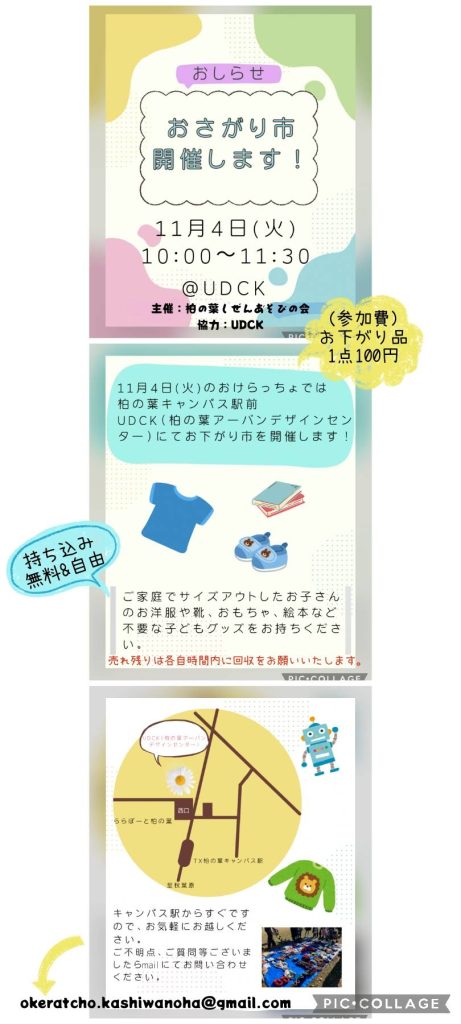 お下がり市 イベント詳細 日程: 2025年11月4日 イベント詳細 日付: 2025年11月4日 10:00 AM – 11:30 AM カテゴリ: イベント/event, 子どもも参加できる/kids friendly, 無料で参加できる/free 皆さま、こんにちは! 11月4日(火)のおけらっちょでは、柏の葉キャンパス駅前のUDCK(柏の葉アーバンデザインセンター)にて、「お下がり市」を開催することになりました! ご家庭でサイズアウトしたお子様のお洋服や、靴、おもちゃ、絵本など不要な子どもグッズをお持ちください 集まった品物は(参加費)1点100円でお持ち帰りいただけます。 ※お持ち込みいただいた場合、残った品物は時間内に必ずご自身で回収していただきますようお願いいたします♀️ 過去にもおけらっちょでお下がり市を開催していますが、毎回大盛況で、意外な掘り出し物に出会えた方もチラホラ… どなたでもご自由にご参加いただけますので(見るだけ・持ち込みのみは無料です)、お気軽に遊びにきてください✨ 主催:柏の葉しぜんあそびの会 協力:UDCK #柏の葉 #流山 #柏ママ #自然保育 #リユース #お下がり イベント詳細 開催日:2025/11/4 時間:10:00ー11:30 開催場所:UDCK 主催者名:柏の葉しぜんあそびの会 問合せ先:okeratcho.kashiwanoha@gmail.com イベントURL:https://www.instagram.com/okeratcho?igsh=MTc2b3d4c28xdTNlbA== UDCKの公式アカウントを友だちに追加すると、気になるイベント情報がスマホに届きます。 メールニュース登録 UDCKでは不定期でメールニュースを配信しています。 柏の葉から最新のまちづくり情報をお届けします。 ◉メールアドレス * ◉性別 *男性女性未選択 ◉お住まい(最寄り駅) *柏の葉キャンパス柏たなかその他柏市市外 /* real people should not fill this in and expect good things – do not remove this or risk form bot signups */