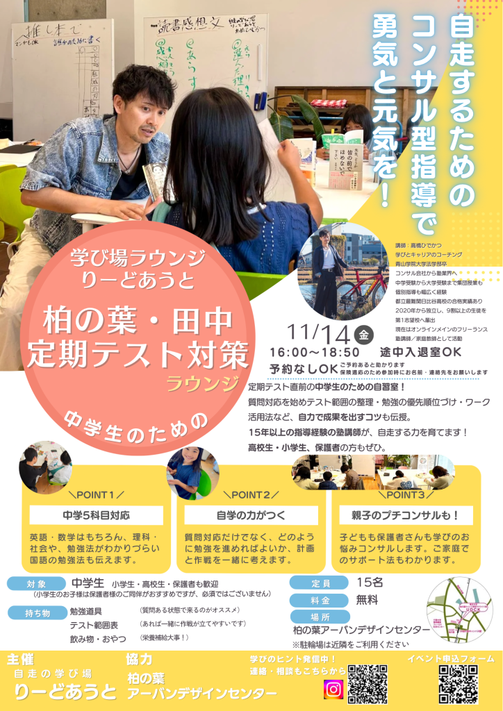 定期テスト対策ラウンジ イベント詳細 日程: 2025年11月14日 イベント詳細 日付: 2025年11月14日 4:00 PM – 6:50 PM カテゴリ: イベント/event, 子どもも参加できる/kids friendly, 無料で参加できる/free 定期テスト直前の中学生のための自習室! 質問対応を始めテスト範囲の整理・勉強の優先順位づけ・ワーク活用法など、自力で成果を出すコツも伝授。 15年以上の指導経験の塾講師が、自走する力を育てます! 高校生・小学生、保護者の方もぜひ 2025/11/14(金) 16:00〜18:50(途中入退室OK) 対象:中学生 (小学生高校生その保護者も歓迎) (小学生のお子様は可能なら保護者のご同伴がおすすめすが、必須ではございません。) 定員:15名 参加費:無料 持ち物:筆記用具、勉強道具、テスト範囲表、飲み物・おやつ(必要であれば!) お問い合わせはこちらから seikajuku2020@gmail.com イベント詳細 開催日:25/11/14 時間:16:00-18:50 開催場所:UDCK 主催者名:自走の学び場りーどあうと 問合せ先:seikajuku2020@gmail.com イベントURL:https://forms.gle/7zufbyMxkfWNuqyF6 UDCKの公式アカウントを友だちに追加すると、気になるイベント情報がスマホに届きます。 メールニュース登録 UDCKでは不定期でメールニュースを配信しています。 柏の葉から最新のまちづくり情報をお届けします。 ◉メールアドレス * ◉性別 *男性女性未選択 ◉お住まい(最寄り駅) *柏の葉キャンパス柏たなかその他柏市市外 /* real people should not fill this in and expect good things – do not remove this or risk form bot signups */