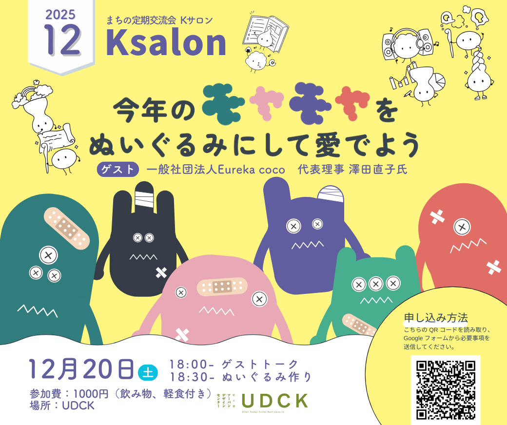 12月Kサロン 年末特別版 イベント詳細 日程: 2025年12月20日 イベント詳細 日付: 2025年12月20日 6:00 PM – 8:00 PM カテゴリ: イベント/event, 子どもも参加できる/kids friendly 🎄12月のKサロンのお知らせ🎄 今回は “土曜日開催”! 平日来られない方も、この機会にぜひ✨ 🧸テーマ 「今年のモヤモヤをぬいぐるみにして愛でよう」 🗓 12月20日(土) 18:00〜ゲストトーク 18:30〜ぬいぐるみ作り ※クリスマス花火も一緒にみましょう🎆 📍UDCK 💴 参加費1000円(飲み物・軽食つき) 今年をやさしく締めくくる夜にしましょう🌙 お申込みはこちら👇 https://forms.gle/NVkpsLinkRuFepPd9 イベント詳細 開催日: 2025年12月20日(土) 開始時間: 18:00 終了日: 2025年12月20日(土) 終了時間: 20:00 開催場所: 柏の葉アーバンデザインセンター(UDCK) 主催者名: 柏の葉アーバンデザインセンター(UDCK) 問い合わせ先: info@udck.jp(糸島) イベントURL: https://forms.gle/NVkpsLinkRuFepPd9 UDCKの公式アカウントを友だちに追加すると、気になるイベント情報がスマホに届きます。 メールニュース登録 UDCKでは不定期でメールニュースを配信しています。 柏の葉から最新のまちづくり情報をお届けします。 ◉メールアドレス * ◉性別 *男性女性未選択 ◉お住まい(最寄り駅) *柏の葉キャンパス柏たなかその他柏市市外 /* real people should not fill this in and expect good things – do not remove this or risk form bot signups */