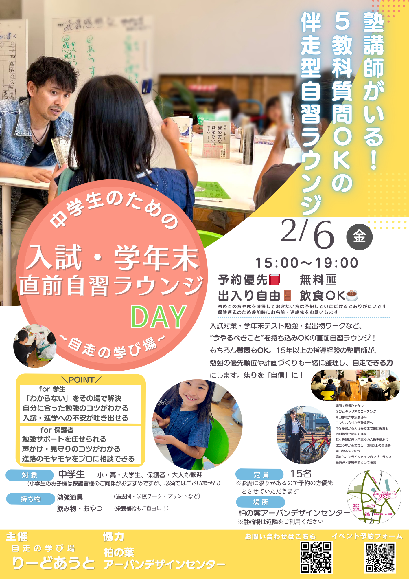 【中学生のための】入試・学年末直前自習ラウンジ イベント詳細 日程: 2026年2月6日 イベント詳細 日付: 2026年2月6日 3:00 PM – 7:00 PM カテゴリ: イベント/event, 子どもも参加できる/kids friendly, 無料で参加できる/free, 知る・学ぶ/education 入試対策・学年末テスト勉強・提出物ワークなど、“今やるべきこと”を持ち込みOKの直前自習ラウンジ! もちろん質問・相談もOK。15年以上の指導経験の塾講師が、 勉強の優先順位や計画づくりも一緒に整理し、自走できる力にします。楽しく自信をつける! イベント詳細 2026/2/6(金) 15:00〜19:00(途中入退室OK) 対象:中学生 ※小・高・大学生、保護者・大人も歓迎(小学生のお子様は可能なら保護者のご同伴がおすすめすが、必須ではございません。) 定員:15名 お席に限りがありますのでぜひご予約ください 参加費:無料 持ち物:筆記用具、勉強(仕事)道具、飲み物・おやつ(必要であれば!) 場所:柏の葉アーバンデザインセンター https://maps.app.goo.gl/1Agc9TVN5f3iUNas5 お問い合わせはこちらから seikajuku2020@gmail.com イベントURL: https://forms.gle/ATERtxF6Hadsbbg49 UDCKの公式アカウントを友だちに追加すると、気になるイベント情報がスマホに届きます。 メールニュース登録 UDCKでは不定期でメールニュースを配信しています。 柏の葉から最新のまちづくり情報をお届けします。 ◉メールアドレス * ◉性別 *男性女性未選択 ◉お住まい(最寄り駅) *柏の葉キャンパス柏たなかその他柏市市外 /* real people should not fill this in and expect good things – do not remove this or risk form bot signups */
